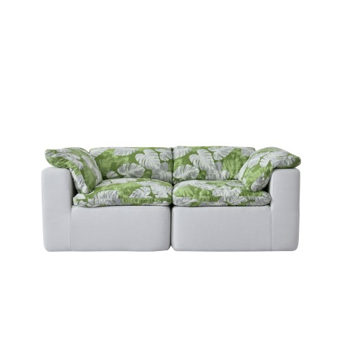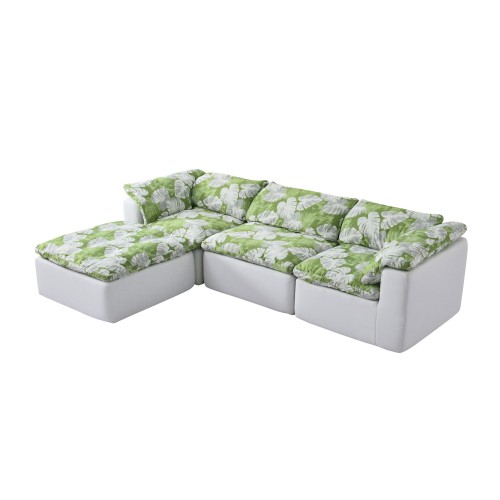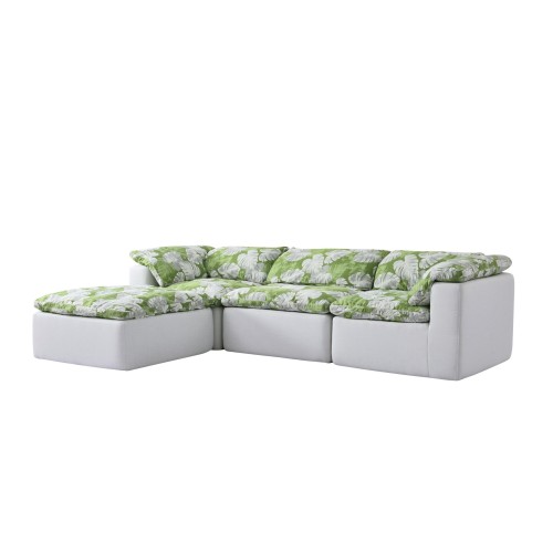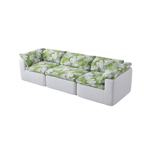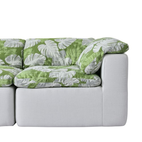 自然からインスピレーションを得た贅沢を体験: 各モジュールは、鮮やかなグリーンのベースに、さわやかな白いトロピカルリーフのモチーフがあしらわれた、美しく通気性のあるコットンリネン混紡生地で装飾されています。この花柄は見た目が美しいだけではありません。生地は: