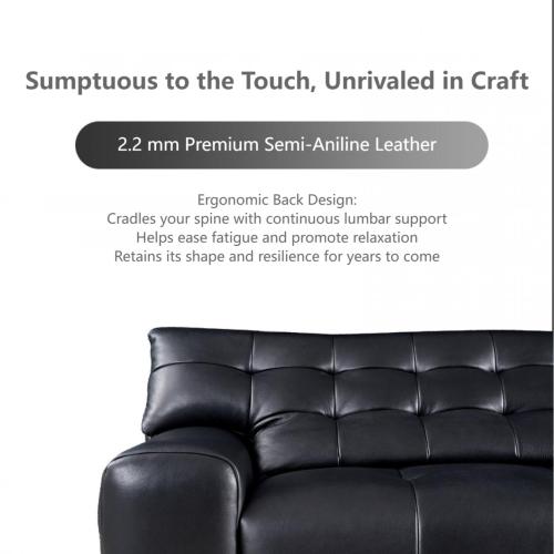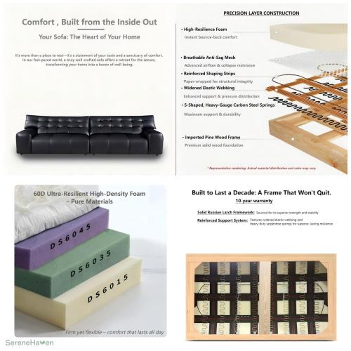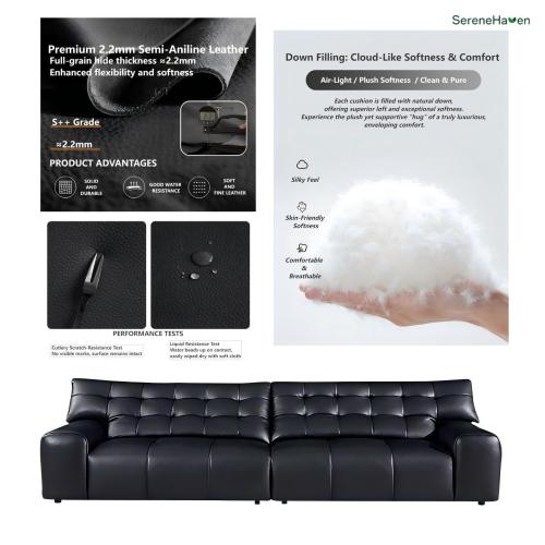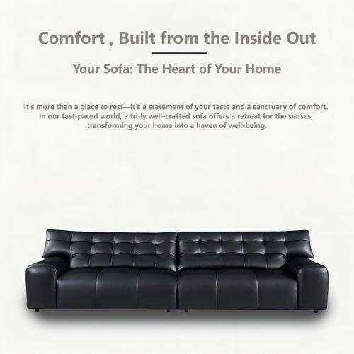 プレミアムな素材感: S++ グレードの 2.2 mm セミアニリン レザーで布張りされたこのソファは、柔らかく耐久性があり、耐水性のある表面を備えています。内部は、60D 高密度フォームや無垢材フレーム上の炭素鋼スプリングの支持システムなど、精密な構造で層を成しており、何年も続く一日中の快適さを保証します。
