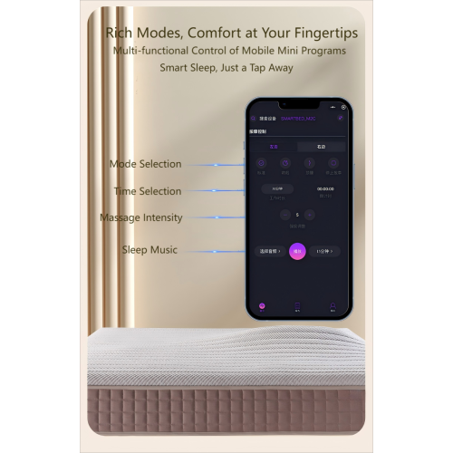 標準、スリープエイド、バックサポートなどの多様なモードから選択し、すべてワイヤレスリモコンまたはスマートフォンアプリで制御できます。タイマーを設定したり、マッサージの強さを調整したり、心地よい睡眠音楽を再生したりして、総合的なリラクゼーション体験を実現します。
