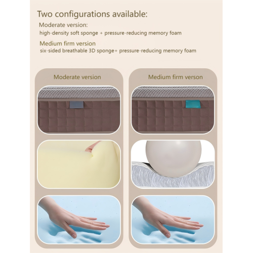 お好みの硬さレベルに合わせて、中程度バージョン(高密度ソフトスポンジ + 低反発フォーム)または中硬バージョン(6 面通気性 3D スポンジ + 低反発フォーム)をお選びください。